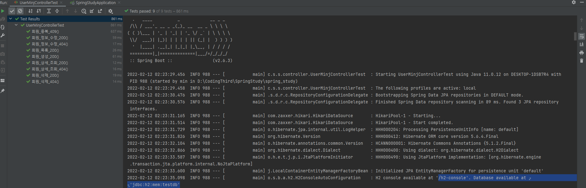 테스트 코드를 돌렸을 때 h2 디비가 성공적으로 연결된 걸 확인할 수 있다.
