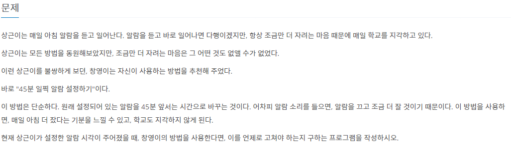 원래 설정되어 있는 알람을 45분 앞서는 프로그램을 작성하세요.