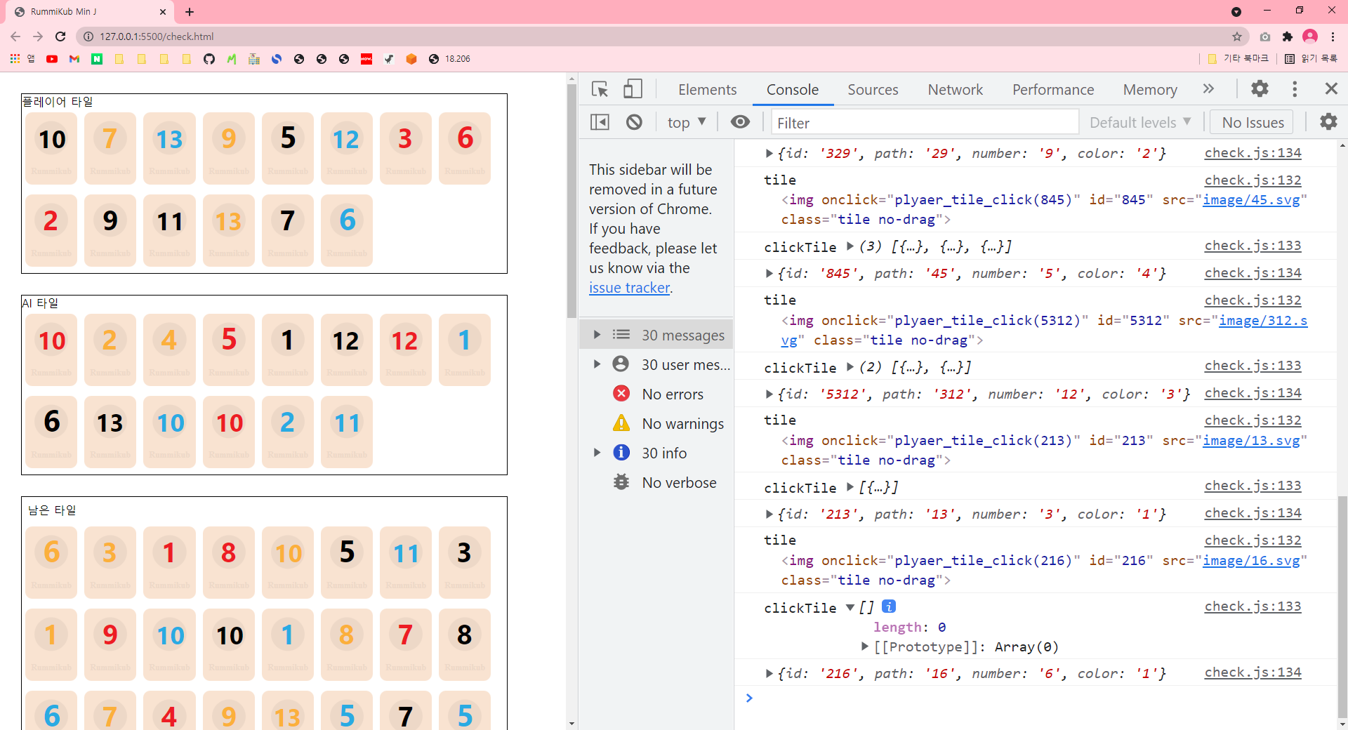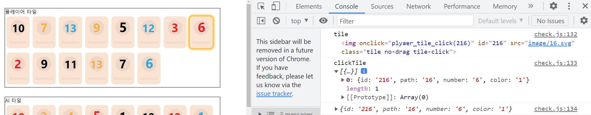clickTile 배열에 타일의 정보가 잘 들어간 걸 확인할 수 있다.