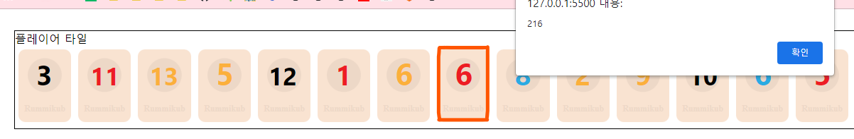 빨간색 중 첫번째 묶음의 6이라2, 빨간색이라 1, 타일의 숫자 6, 216이 잘 찍힌걸 확인할 수 있습니다.