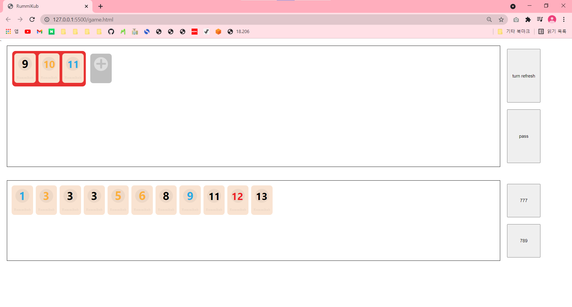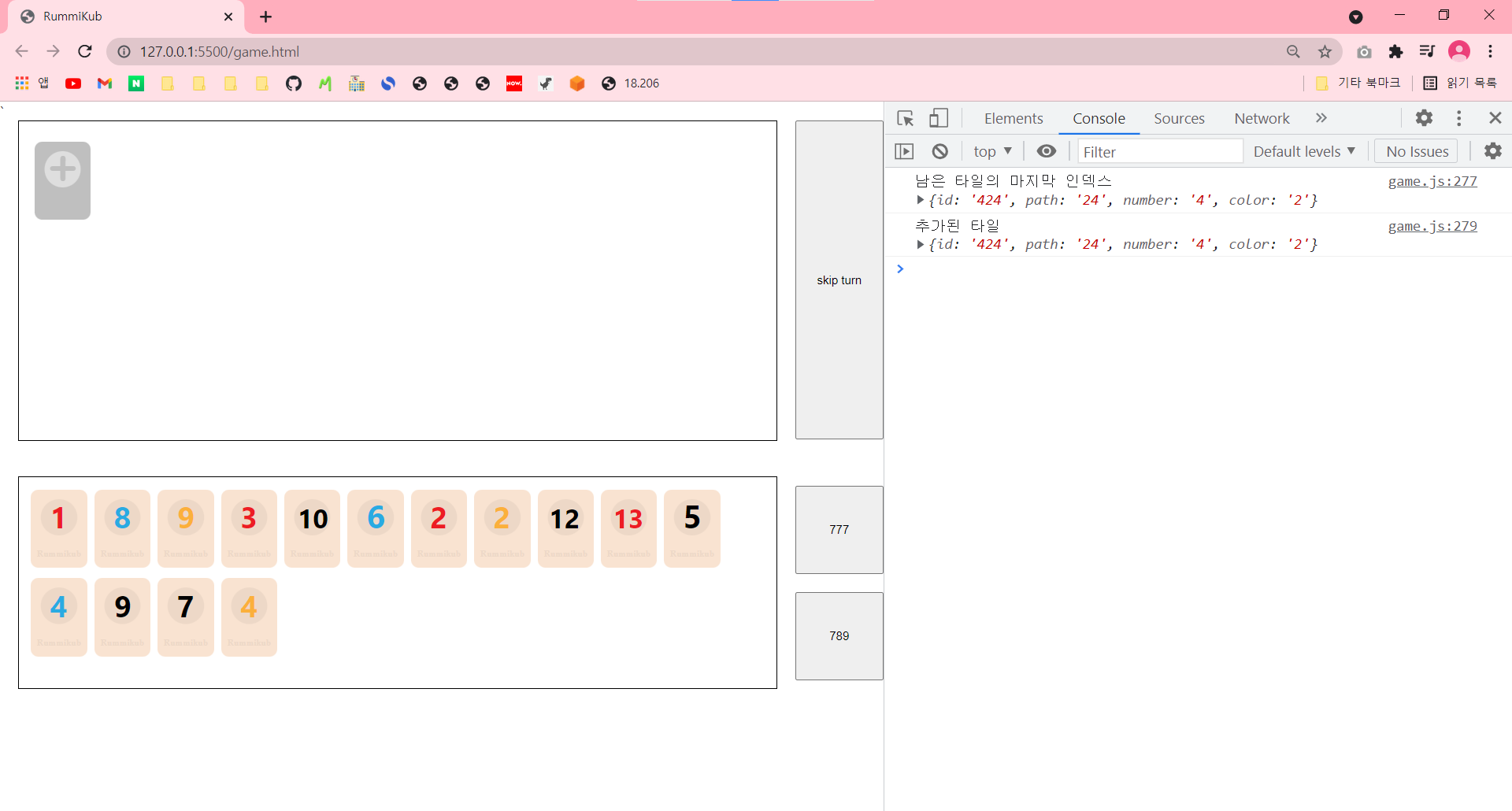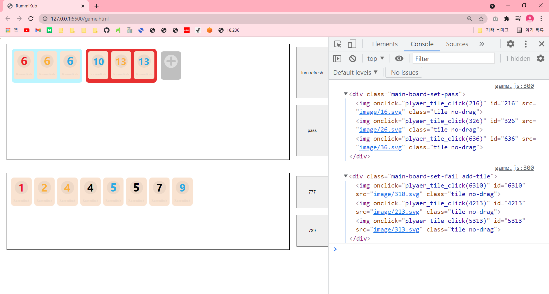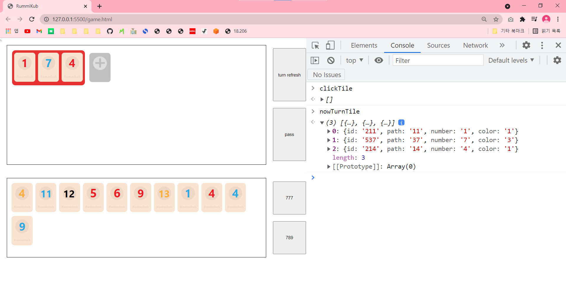 const clickTile = []; const nowTurnTile = []; // 추가 코드 ... function player_tile_click(id) { // alert(id); const tileInfo = playerTile.findIndex((e) => { return e.id == id; }); const tile = document.getElementById(id); if (!tile.classList.contains('tile-click')) { clickTile.push(playerTile[tileInfo]); nowTurnTile.push(playerTile[tileInfo]); // 추가 코드 } ... }