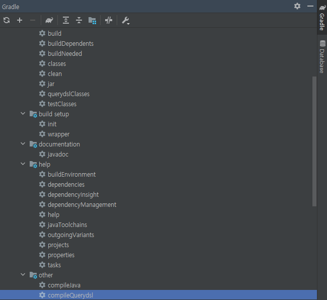 Gradle > other > complieQuerydsl이 추가되어 있는 걸 확인할 수 있다!