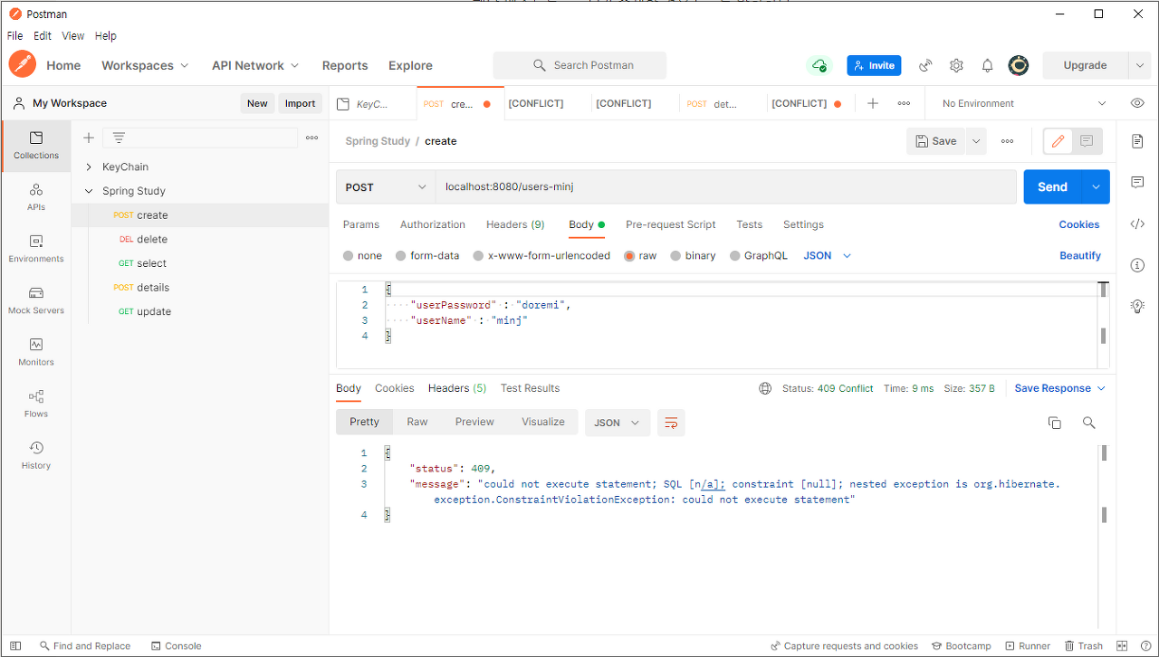 직접 예외를 생성하지 않는다면 500이 반환되어, 409와 함께 이미 존재하는 회원이라는 예외를 던져준다.