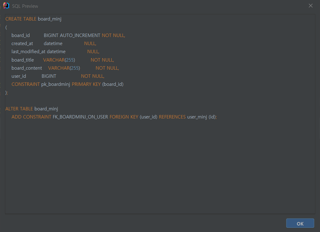 1. 프로젝트를 실행시켜 해당 디비의 테이블에서 컬럼 확인이 가능하다.