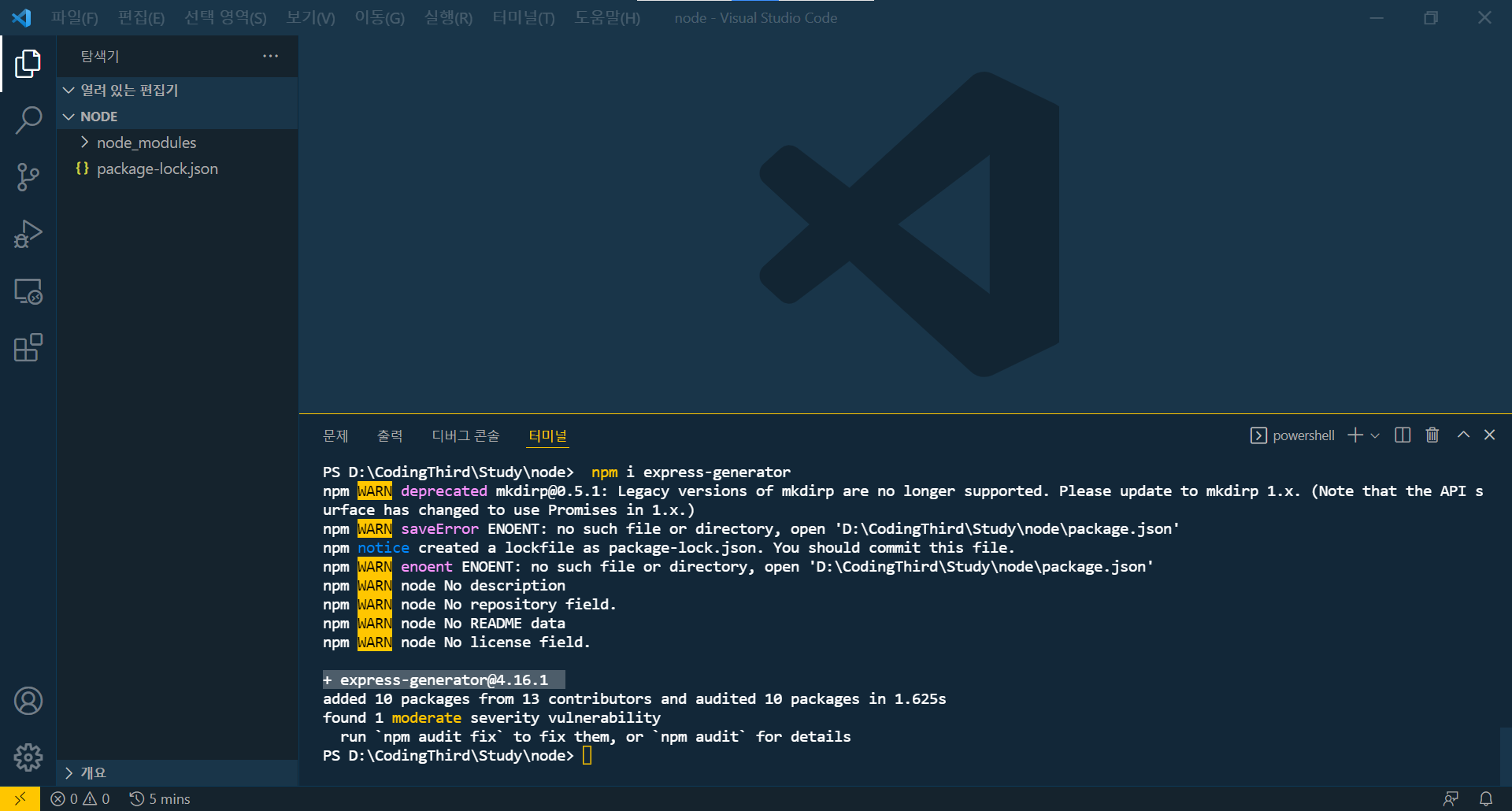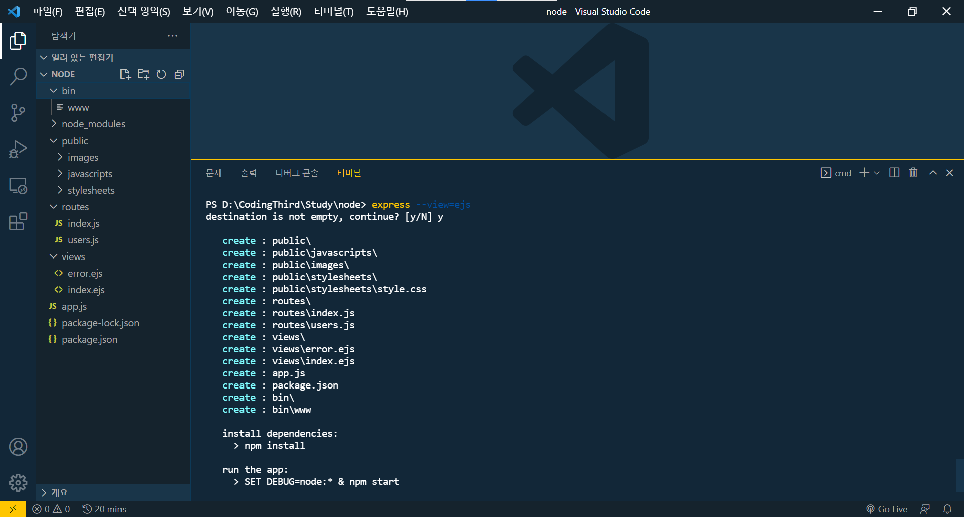 express 설치는 vs code의 터미널을 사용하여 설치했습니다. 파일 내부에서 cmd로 설치하는 것과 동일합니다.