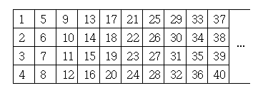 놀이의 방법은 간단하다. 일단 4줄짜리 표에 왼쪽부터 수를 아래로 1부터 순서대로 적어나간다. 다음에 그 예가 잘 나타나있다.