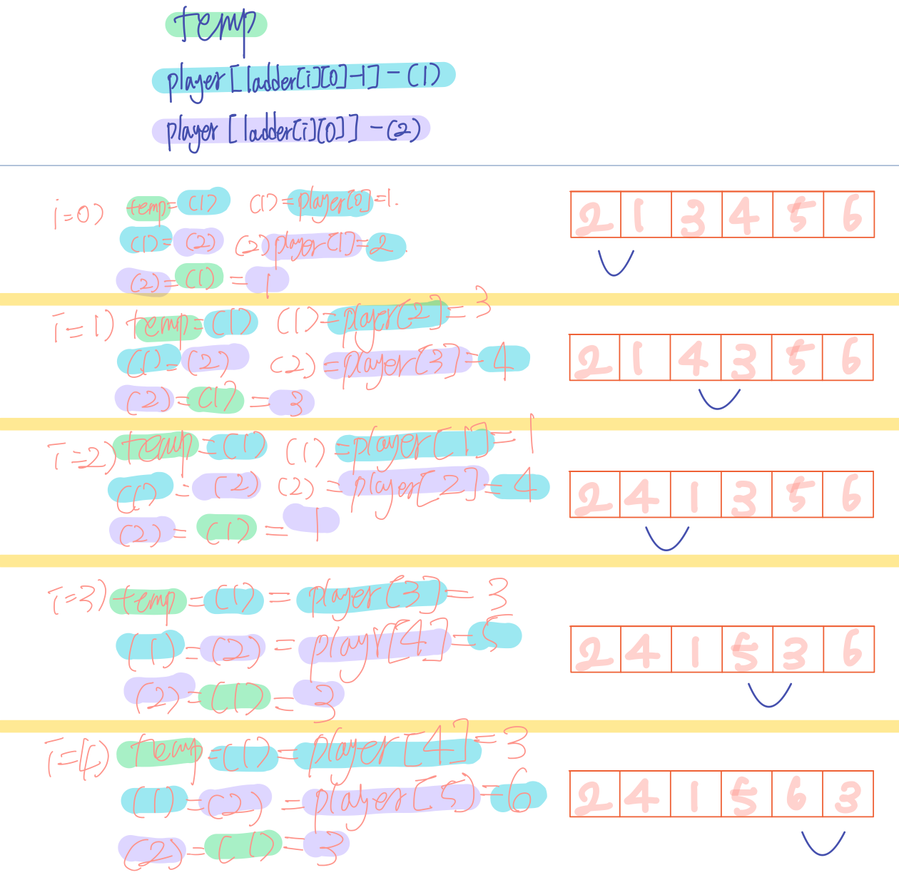 temp에 player[ladders[i][0] - 1](1)을 담는다.
