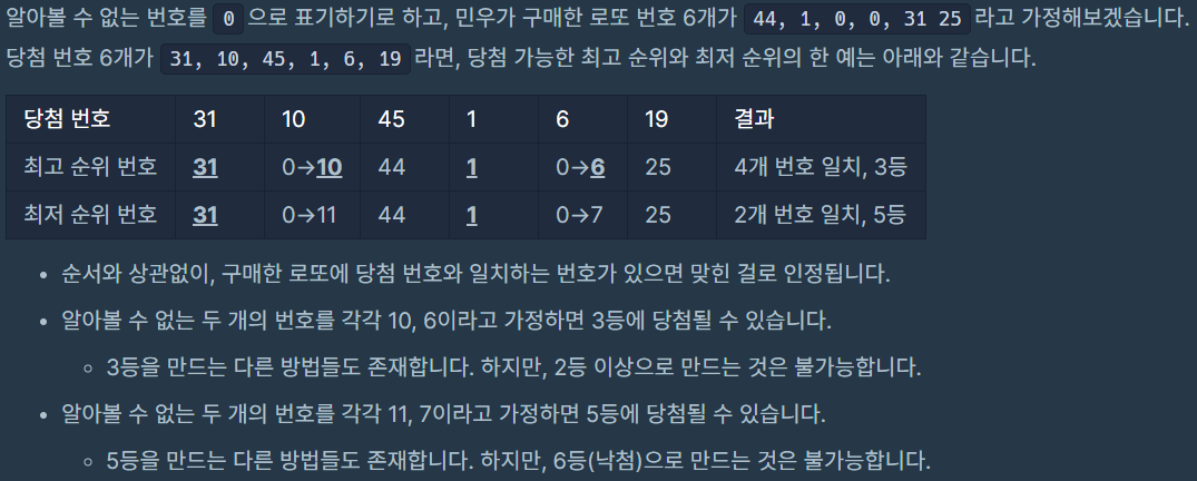 민우가 구매한 로또 번호를 담은 배열 lottos, 당첨 번호를 담은 배열 win_nums가 매개변수로 주어집니다. 이때, 당첨 가능한 최고 순위와 최저 순위를 차례대로 배열에 담아서 return 하도록 solution 함수를 완성해주세요.